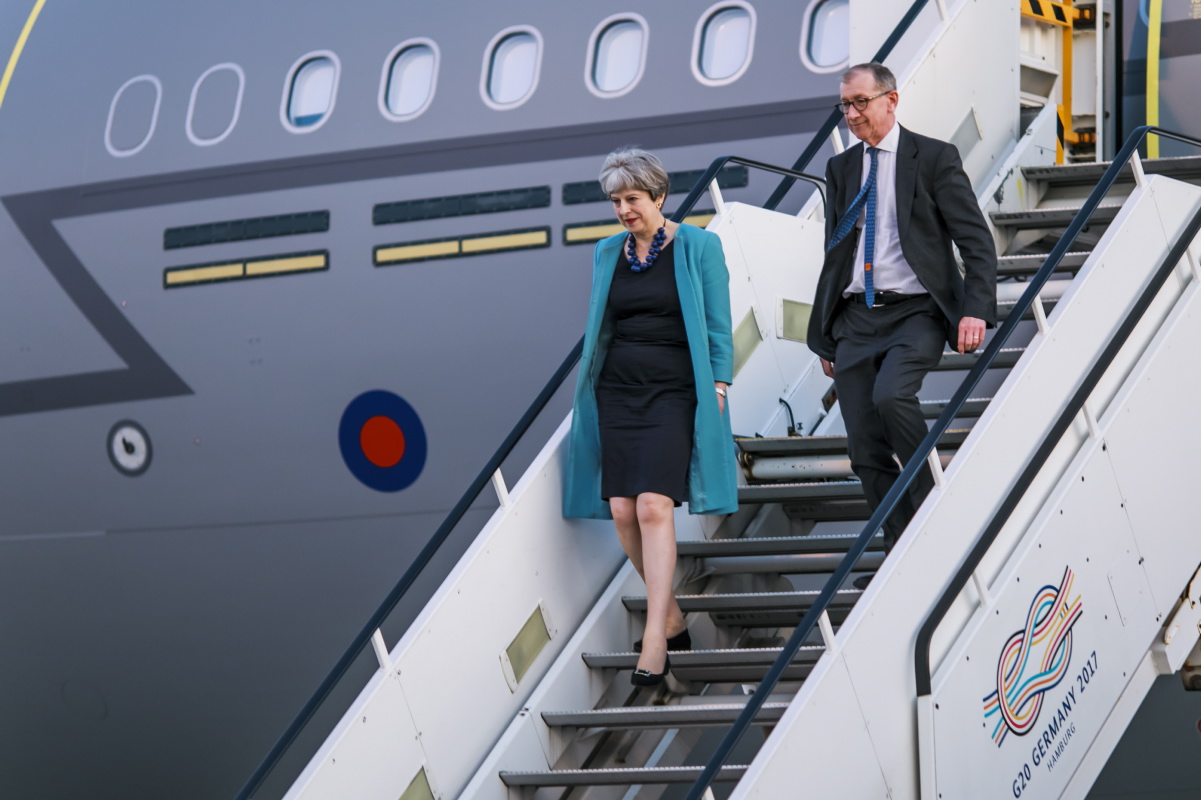 Ankunft der britischen Premierministerin Theresa May und ihres Mannes Philip am Hamburger Flughafen.